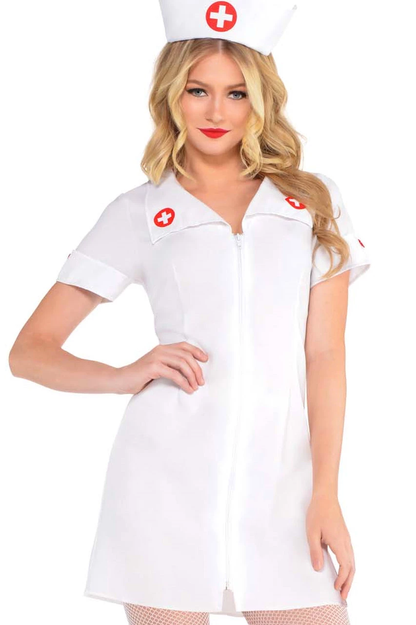 This On Call Nurse Costume features a white mini dress with red crosses, a wide collar, low cut V-neck, and a matching all-fabric hat makes this nurse outfit a dose of success!
