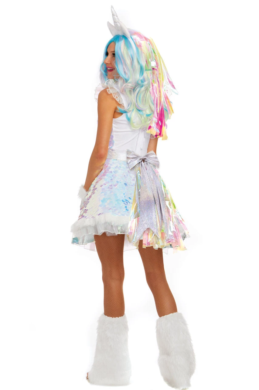 This sequin Unicorn costume includes a mini dress with all over sequin paillettes, ruffled trim, furry fingerless gloves, tail, and unicorn headpiece.