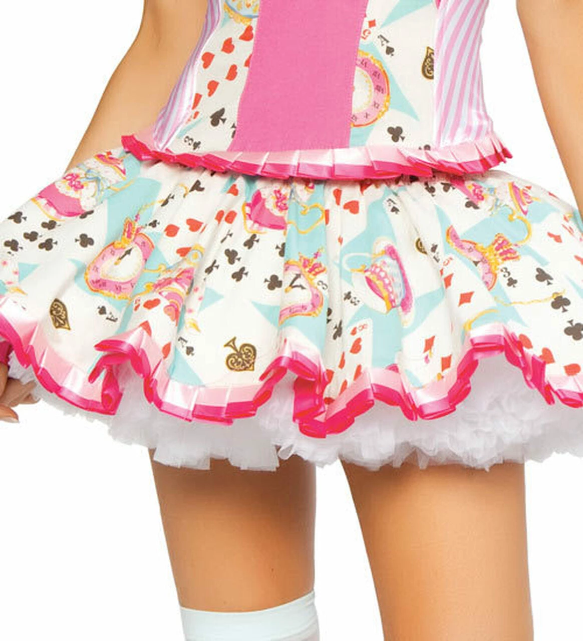 Three Piece After Party Alice Costume includes Lace-up Back Corset with Pleated Trim, Matching Mini Skirt, Brass Key Headband. Made in USA, Shown with R1451 Two Layer Petticoat not included.