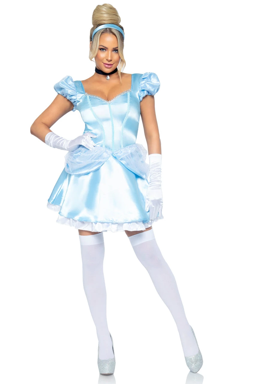 This three-piece, Storybook Cinderella costume for Adults includes a blue satin, mini ball gown with ruffle trim, jewel choker, and headband. (Petticoat, gloves, and stockings not included in this adult Cinderella costume.)