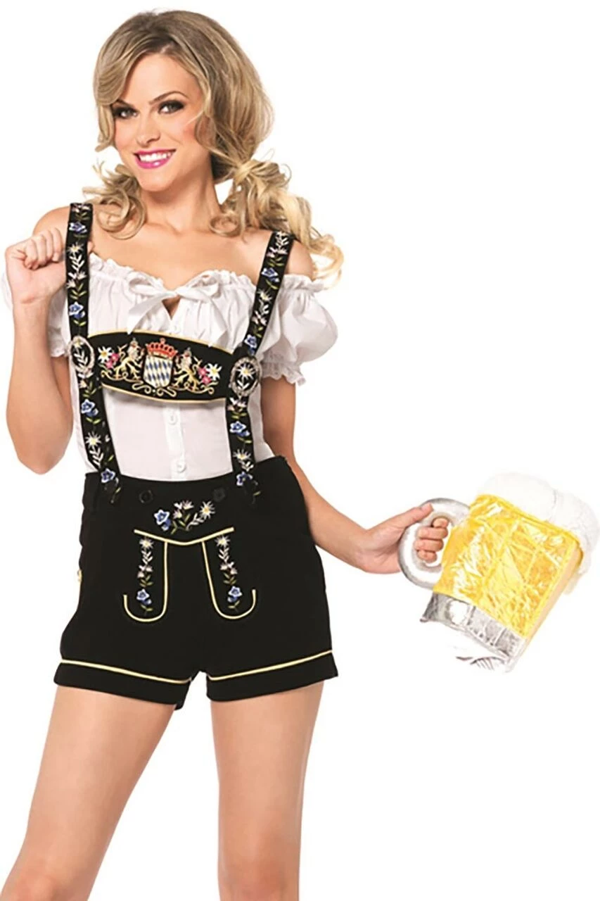 Pour a pint or two in this two-piece Women’s Lederhosen costume featuring embroidered stretch velveteen lederhosen with authentic bib suspenders and a matching white peasant top. (Beer mug purse not included.)