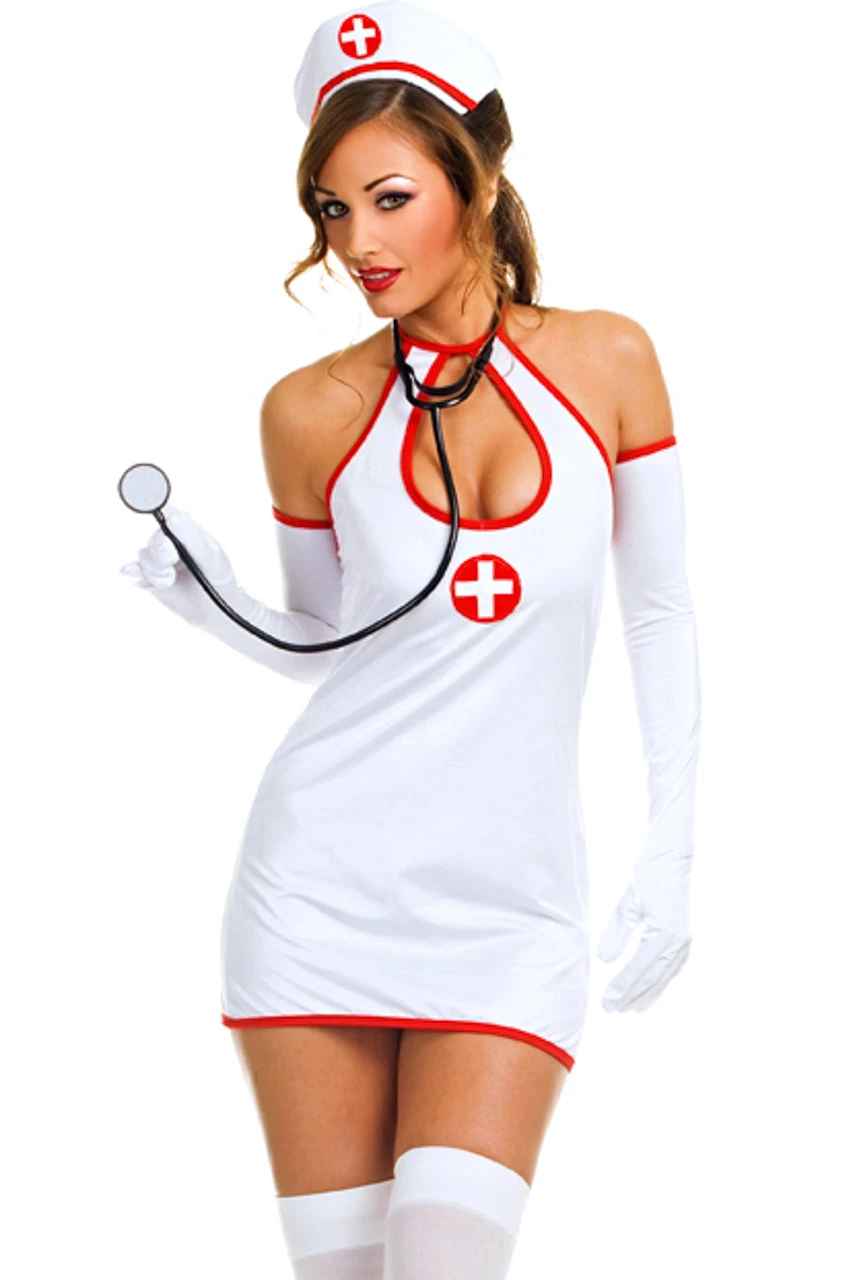 This sexy Dark Nurse costume includes a black mini dress with keyhole cut out, red trim, red cross detail, and matching nurse hat headband.