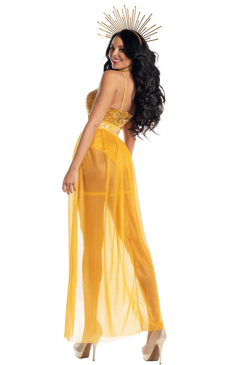 This Rising Sun Beauty costume includes a gold sequin teddy with a strappy bust, attached leg garters, a gold lame’ belt with attached flowy skirt, and a gold, sunburst headpiece.