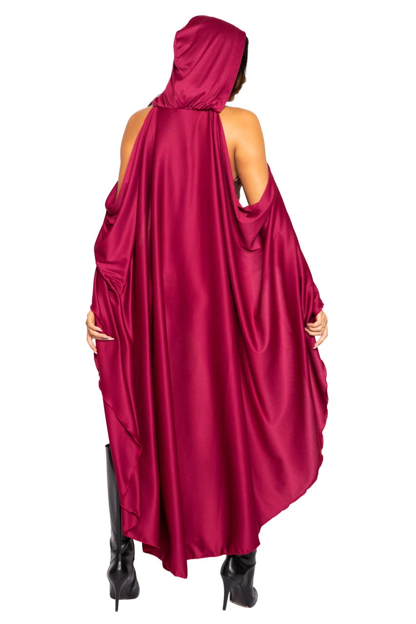 This Deluxe Riding Hood costume includes a pink and white romper and a brown, faux suede harness with an attached red hooded cape.