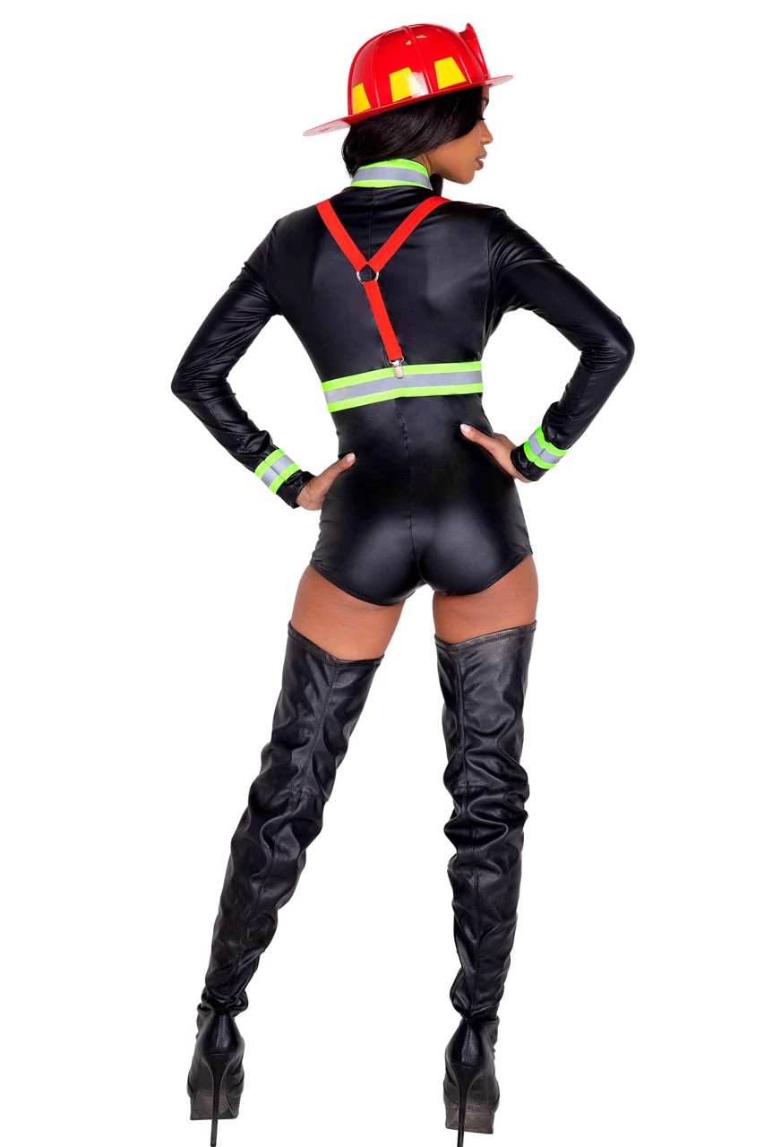 This three-piece, Hot Fire Woman costume includes a black romper with long sleeves, a zip up front, faux reflective trim, a harness with attached suspenders, and hat.