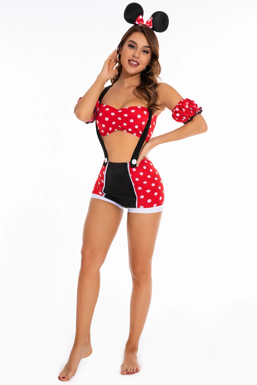 This Pinup Mouse costume includes a red and white polka dot print bandeau top, matching high waisted shorts with attached suspenders, puffed arm sleeves and mouse ear headband. (Stockings not included.)