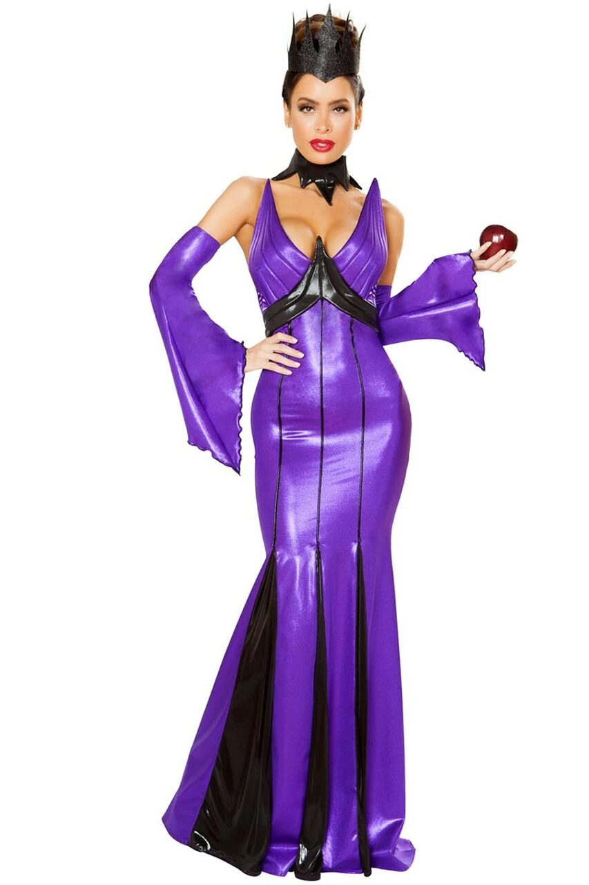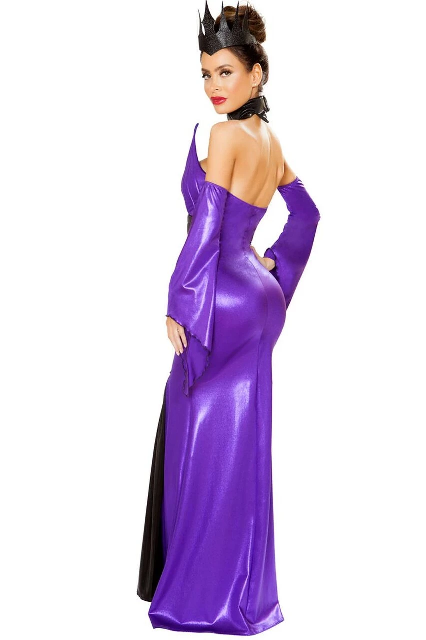 This Purple Wicked Queen costume includes a full-length dress with a strapless silhouette, an upswept bustline, plunging neck, and arm sleeves.Â