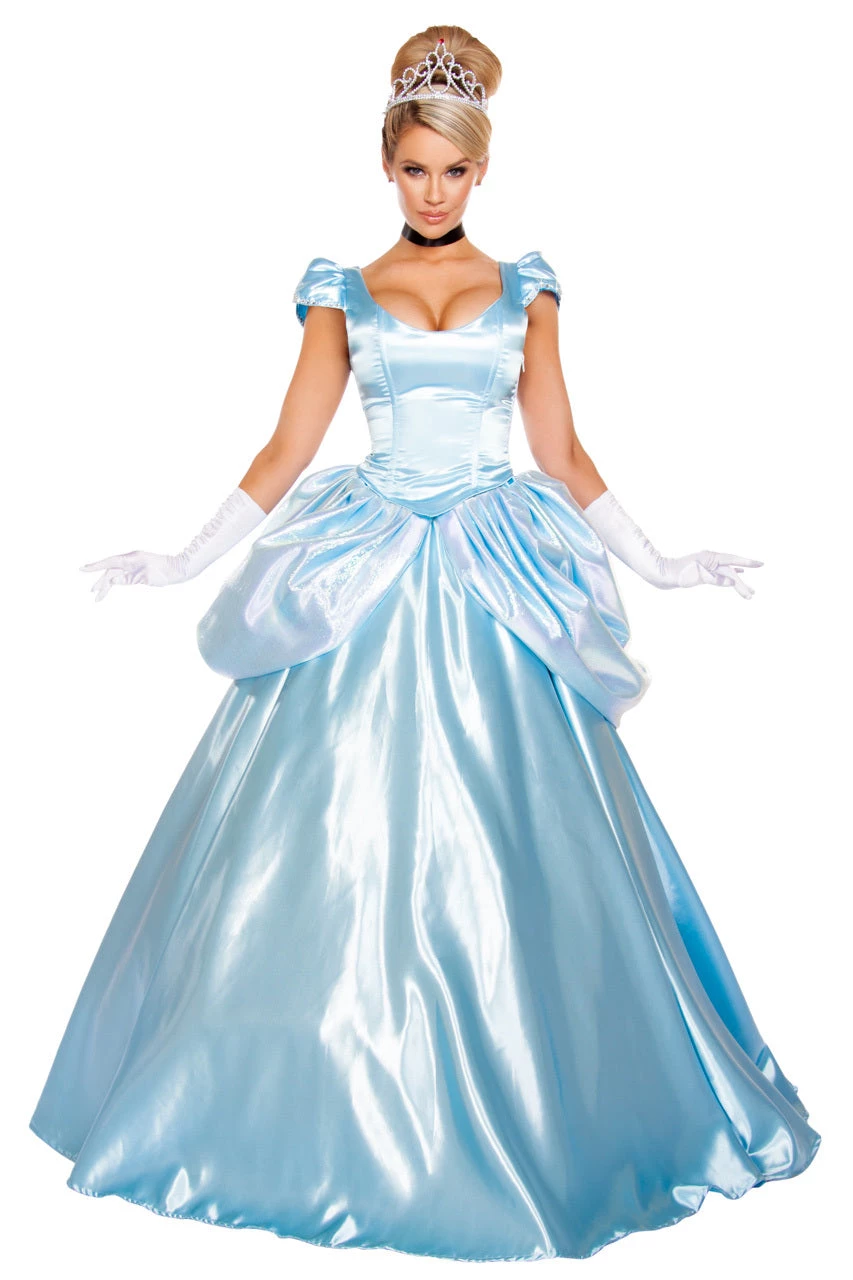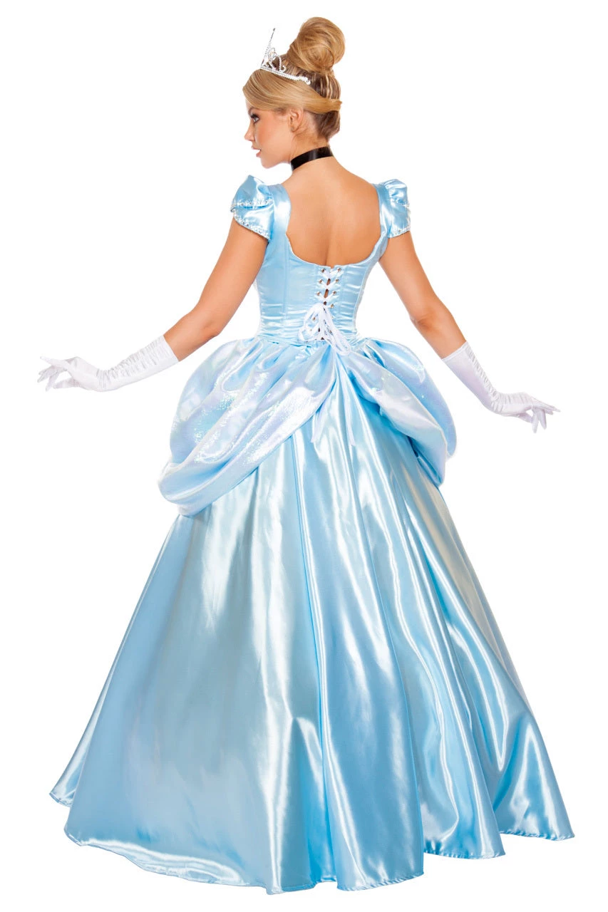 This Stroke of Midnight Maiden costume includes a long blue satin corset top with a lace-up back, puff sleeves, a long blue satin skirt with attached peplums and a tiara. (Gloves and petticoat not included.)