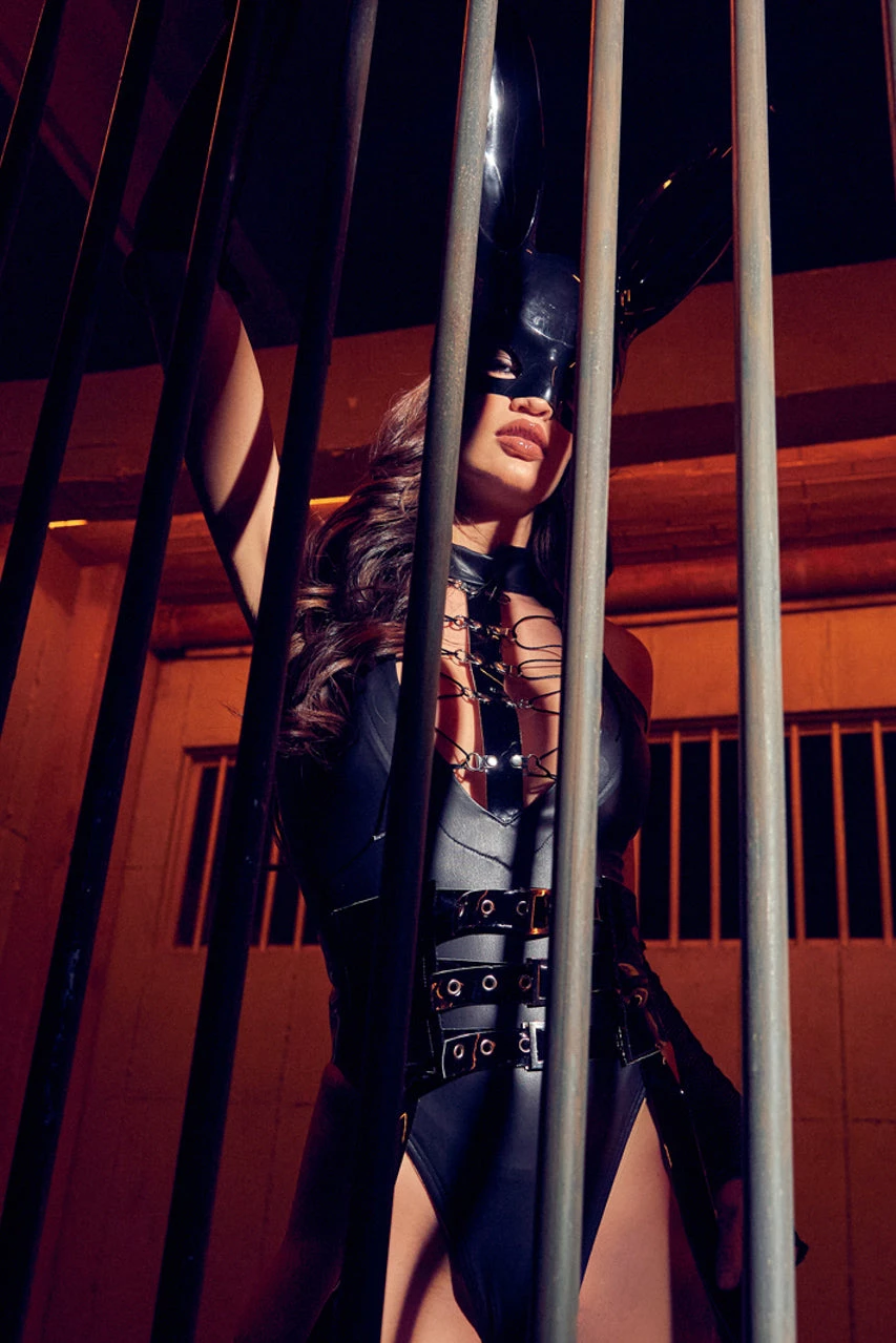 This five-piece, Dominatrix Bunny costume includes a black bodysuit with a low cut, lace-up bust, black vinyl details, a strappy black vinyl waist cincher with attached garter straps, fingerless gloves, bunny mask, and a whip.